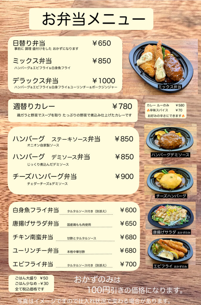 2026.03.09 メニュー(日替り弁当 新メニュー等のご案内) 2026.3.1~ メニュー 2月末迄で グラタンハンバーグ と シーフードフライ(牡蠣 鱈 大海老)は終了致しました。 3月中旬より シーフードのクリームコロッケ(数量限定)を発売予定しております。