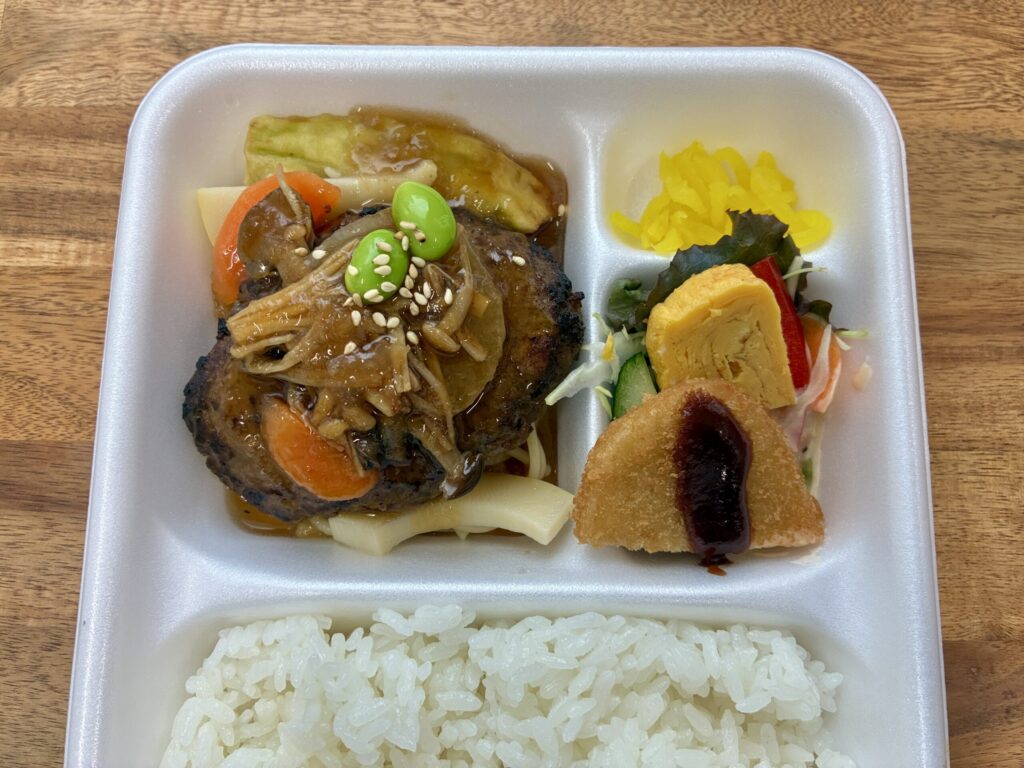 2026.04.13 メニュー(日替り弁当 新メニュー等のご案内) 4/14(火) 日替り弁当 : ハンバーグ 具だくさん和風ソース *具だくさん和風ソース : 大根•人参•筍•しめじ•エノキが入っています。